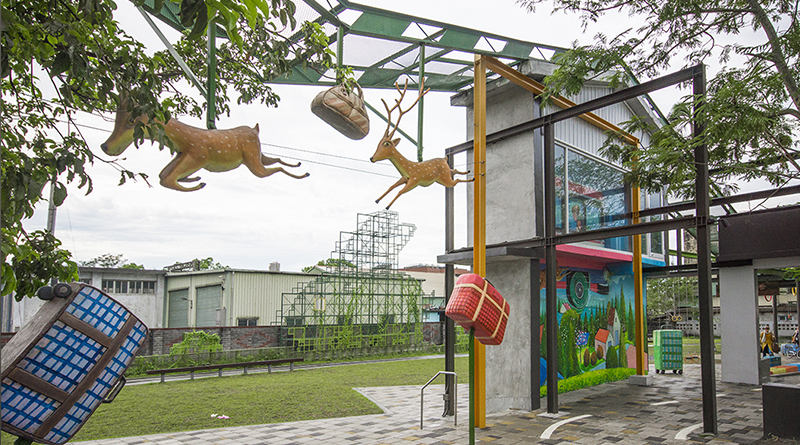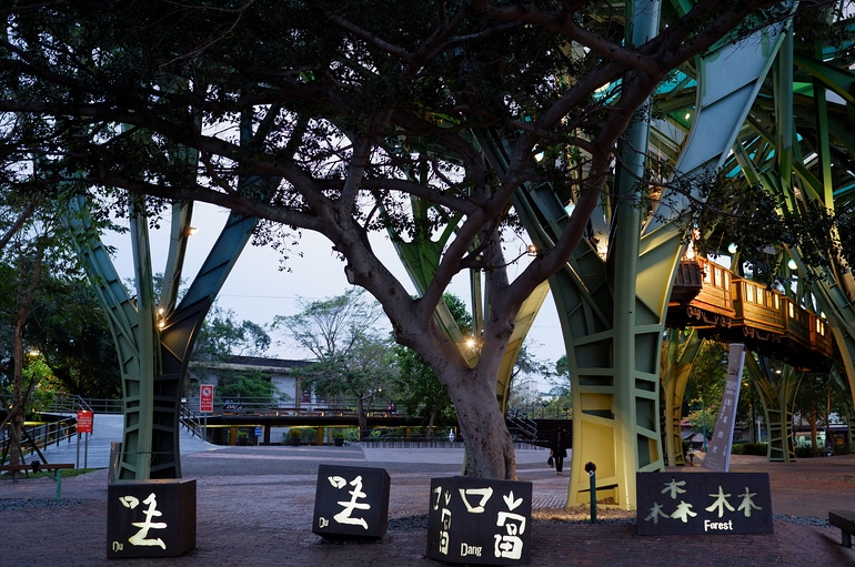 丟丟噹森林 : 九株高達十四公尺的鋼構巨樹,加上充森滿童真與夢幻的幾米星空列車和一旁復古的百果樹紅磚屋,就是可愛的丟丟噹林啦。
