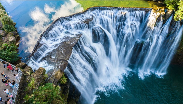 十分瀑布: 十分瀑布屬於垂簾型瀑布,瀑布兩旁的岩層走向與水流相反,是地理學上的逆斜層特徵,因與北美洲尼加拉瀑布景色相似,故有臺灣尼加拉瀑布之稱。由於瀑布下方的水潭極深,在壯闊的河流沖擊下激起陣陣水花,當陽光照射朦朧的水氣,可見一道彩虹斜掛於瀑布或水潭上,故有「彩虹淵」的美名。